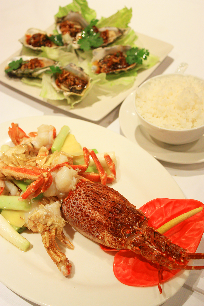主菜上碟後,我們便有機會品嚐這四碟大菜,包括燉原隻大鮑(4頭)、蒜蓉開邊蒸活鮑、炒原隻龍蝦和XO醬焗生蠔,始終我還是覺得這些地道的廣東煮法,相比外國人更能夠把海鮮的原味帶出來。而這道蒜蓉蒸鮑更是比香港更美味,味不在鮑魚本身,而是師傅巧妙地控制了蒜蓉的份量,令鮑魚本身甘甜爽口的味道更突出,叫人樂而忘返,就算自費R450吃也極度值得。