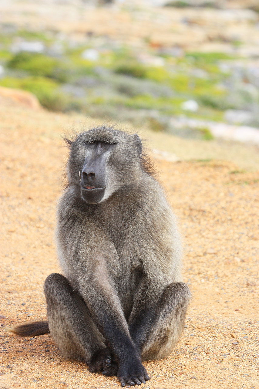 大約3分鐘後,我們前方就出現大約10多隻的狒狒群坐在路旁,其中還有一隻長老,個子高大,為免發生意外,我們只開了小小車窗,把鏡頭伸出去,避面牠們野性難純,情況失控,因為牠們在這裡幾乎惡名昭彰,不少遊客都遭到牠們圍攻。