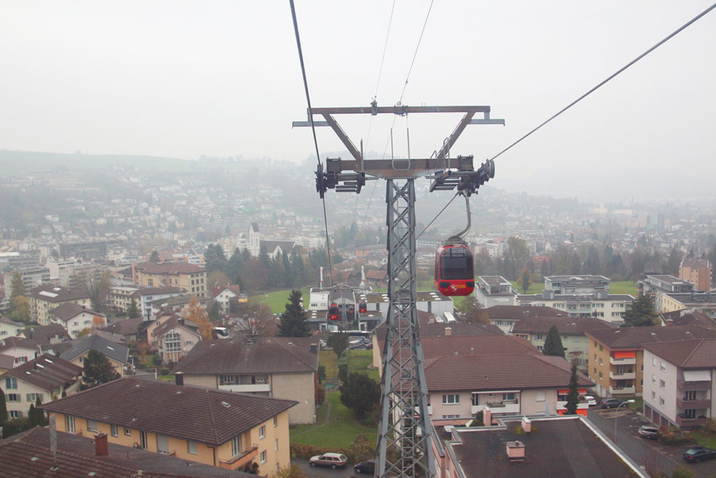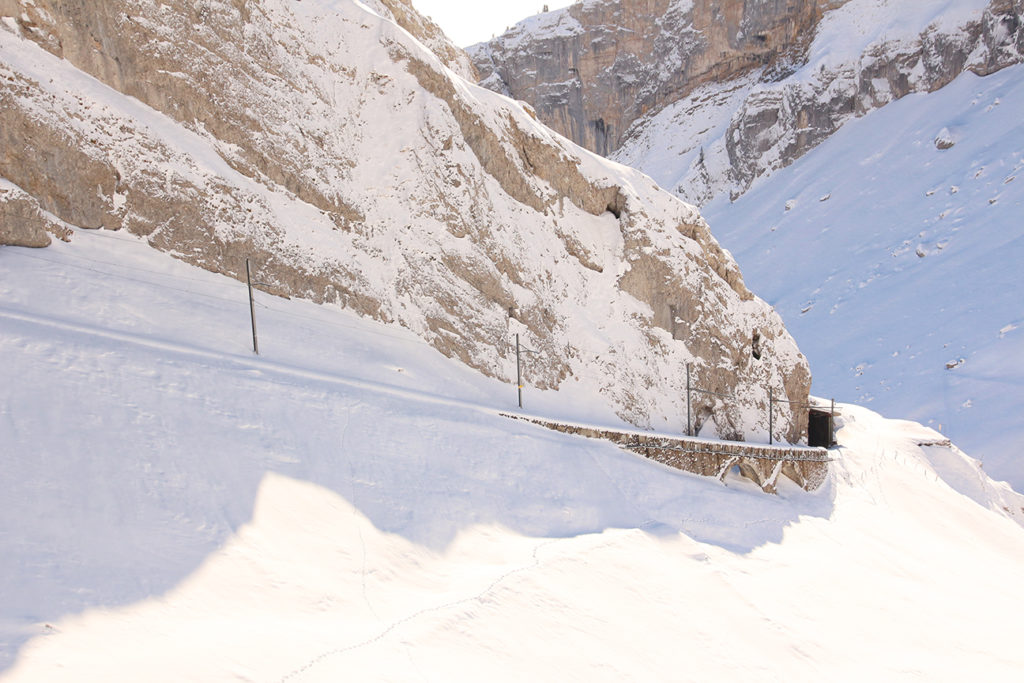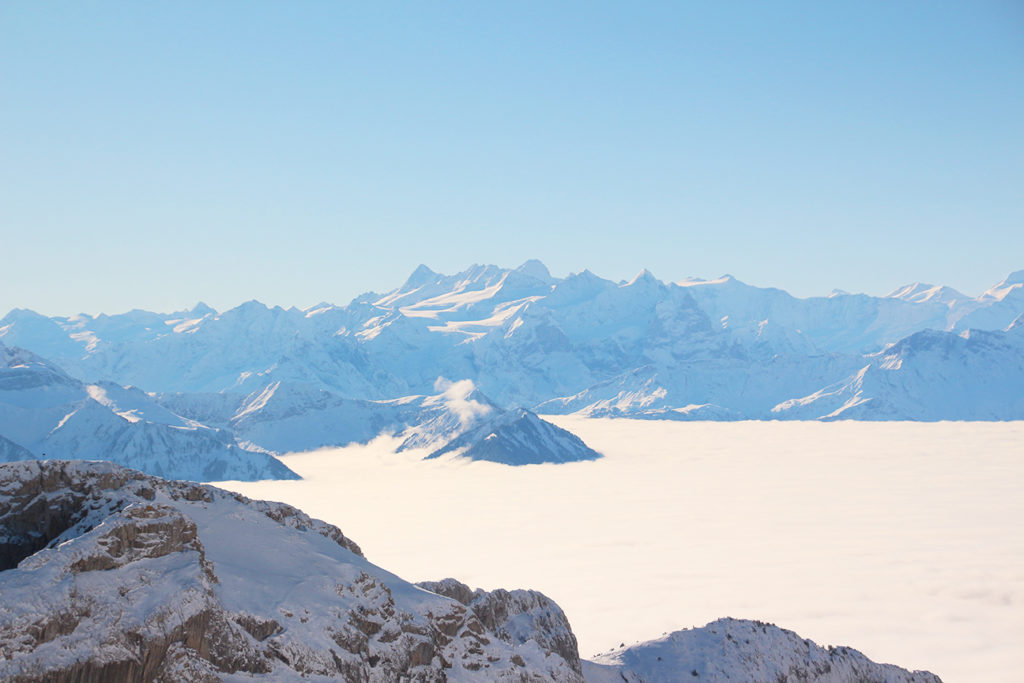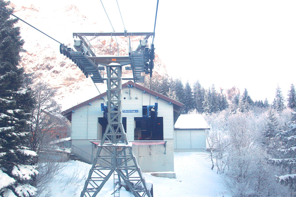 經過 20 分鐘的行程,在還有 1 分鐘就到達 1,416 米的 Fräkmüntegg 山腰吊車站時,突然就穿出了雲層,在我們面前,是一個相當陡峭,連雪也不能積上的山峰,而天色更變得完全清朗,高原無污染的藍天和雪山群峰完全是 20 分鐘前無法相像的境況,瑞士的風景,老土點也要說果然名不虛傳。