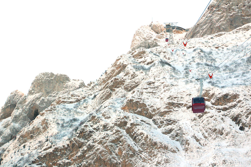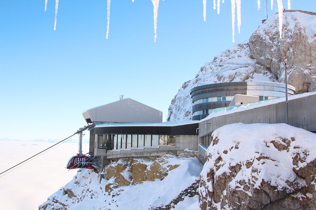 走出 Fräkmüntegg 車站,這裏是登山前最後的平原和樹林,也是皮拉圖爾山腳下的滑雪場,地勢相當平坦。遊客在這裏稍稍停留後,便可直接轉乘另一輛巨型吊車,直接登上 2,132 米的山頂。這款在前年才開辦的 Dragon Ride 吊車,一次過可以接載 55 名乘客,只需 3.5 分鐘就可以穿疏 600 多米,與巨型升降機無異。