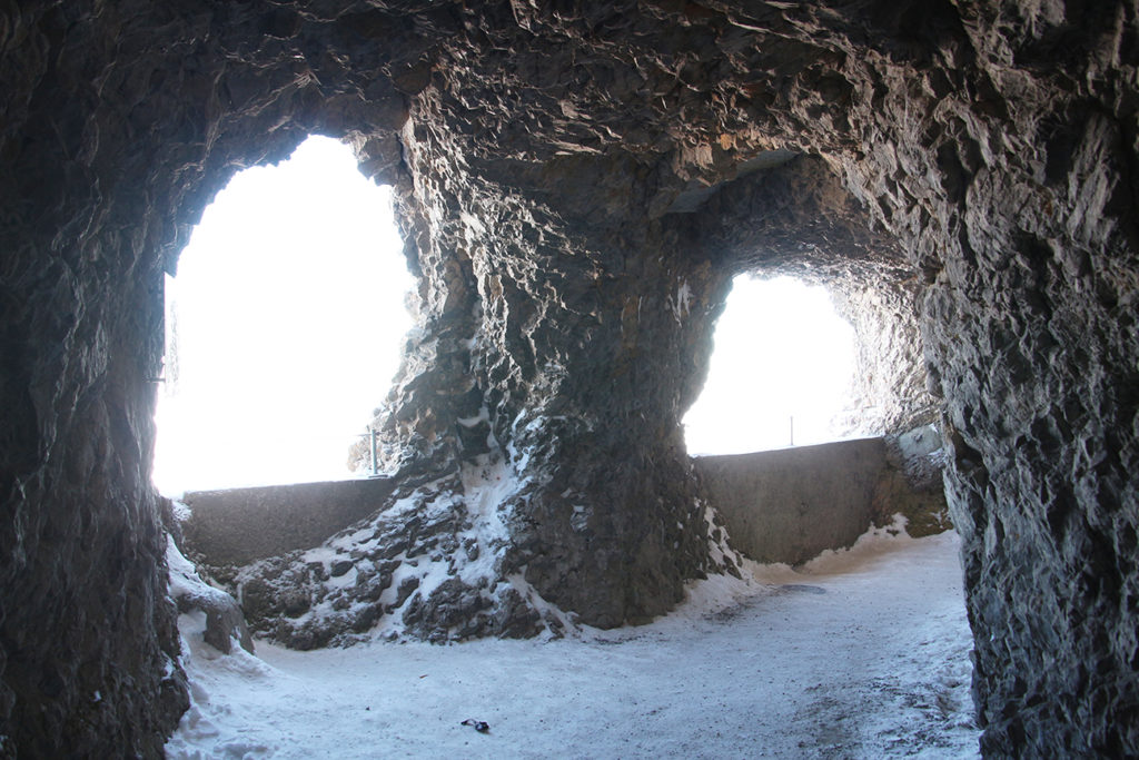 一般的雪山,一般的認知就只有室內外的觀景台。不過,在皮拉圖斯山的山頂,這裏有多條的行山徑和觀景區,雖然部份已被數米的積雪覆蓋而封閉,可是有一條穿越山洞的步行徑大受歡迎,無論積雪多厚也不會封閉。