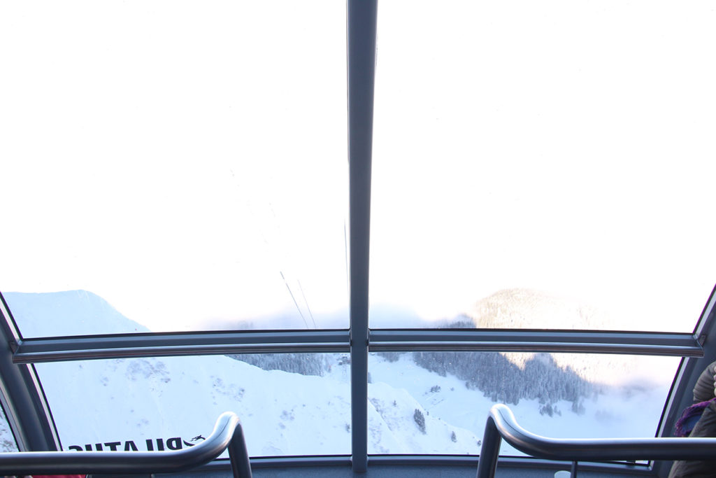 Dragon Ride 比起剛才的四人吊車,擁有特大的窗戶,可以一次過飽覽整個阿爾卑斯山的景色,遠至鐵力士峰和德意交界的山峰也可以見到。可是,在經歷數天大雪天氣後,車頭玻璃很多部份也積滿了雪,只能在罅縫中觀看絕景。