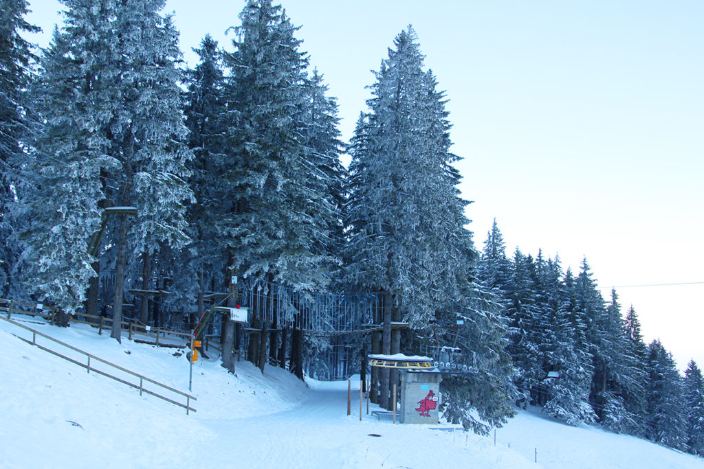 回到 1,416 米的 Fräkmüntegg,趁住下山前,先跑到掛滿冰雪的樹林當中拍照。在這些樹林中,其實滿佈很多行山徑,甚至可以由山腳一直步行到山頂,相比香港的行山徑更清晰和更多指示,不過在完全鋪滿冰雪的地面,我們已經滑倒了好幾次,實在不明白為何還有不少居民能「力保不失」繼續行山。