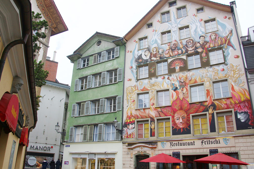 從停車場一走出來就是琉森最著名的木橋 Kapellbrücke,旁邊就是舊城區的中心。這裏有一座外牆畫上很多角色,相當觸目的大樓,新潮味十足,很難令人聯想這原來是間有 415 年歷史的老瑞士餐廳。