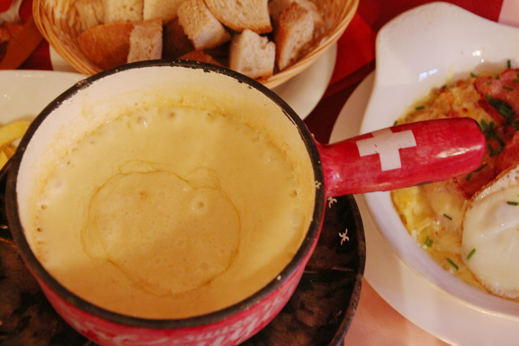 如此寒冷的下午,吃芝士火鍋當然是最佳選擇。其實在瑞士,芝士火鍋是很個人口味的家庭菜,不是很多餐廳會供應,通常都只有遊客較多的餐廳,或老城區的老餐廳才找到,小村落就未必容易吃到。基本的芝士火鍋(Fondue)是以 soft cheese 配上白酒煮成,芝士味恰到好處,不會太膩,很怕濃、發酵味的人也可接受,而 menu 內亦有加入其他食材制作,如加入梨、vodka、香草,甚至辣椒制作的芝士。