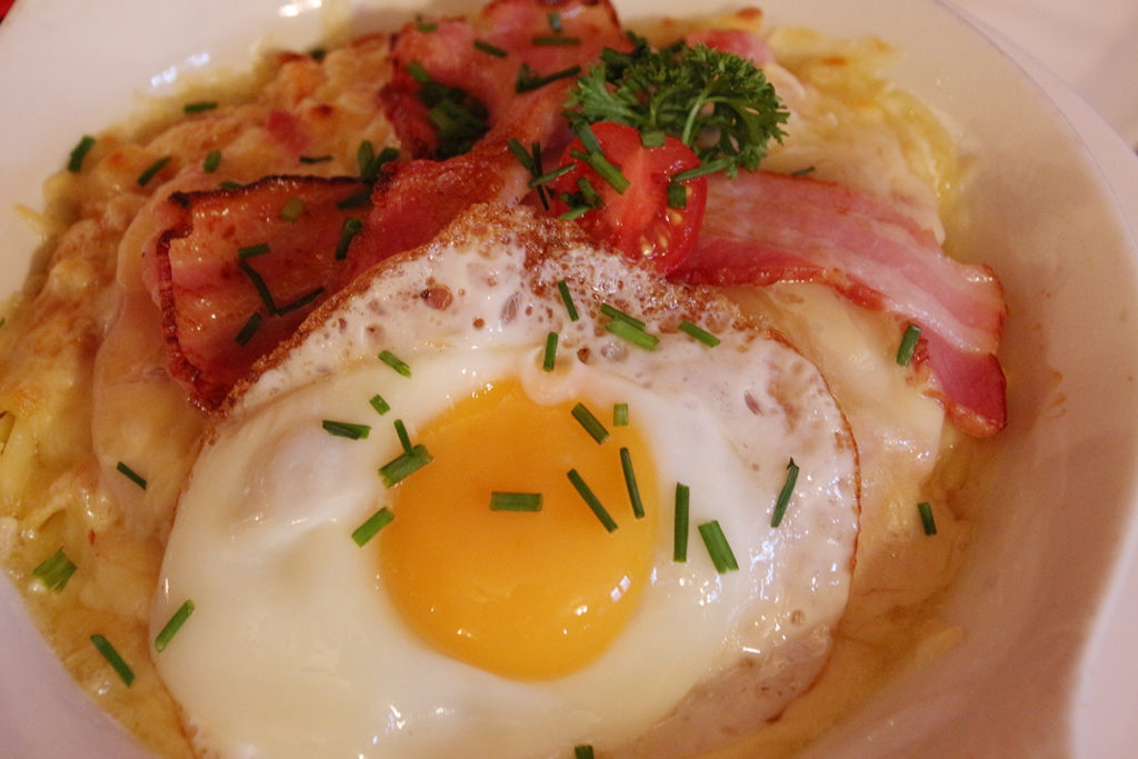 我們就選擇以普通口味入手(CHF 25.6,約 HKD$ 204.8),基本已配上一大盤的麵包,可以浸得軟淋淋放進口中,我們就再加了一碟薯條用來沾芝士。另外,瑞士的薯餅 Rösti 也絕不可錯過,別看輕這款好像薯絲弄成的薯餅,其實很講究技術,只要兩面煎得不好,隨時就會變成炒薯絲。口味方面,我們就叫了Sennen Rösti(CHF 26.9,約 HKD$215.2),當中加入了煙肉、火腿、芝士和煎蛋,口味很像早餐。
