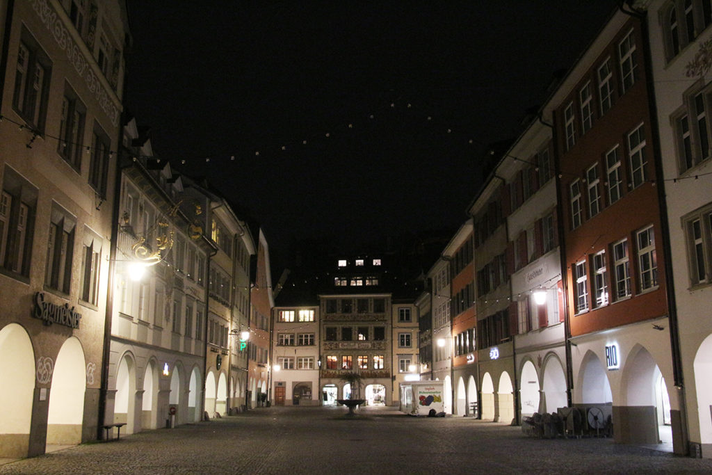 晚上 10 時抵達了市中心,商店大抵全部已經關門,鎮中心廣場還有好幾家餐廳和酒吧尚在營業,更頗為熱鬧,眼見很多瑞士人也寧願渡河消費。我們就選了家意大利餐廳用餐,看慣了瑞士的物價,翻開菜單就會發現了這裏是天堂,一個大 pizza 也是 €13,新鮮的墨魚汁意粉也是 €9,飲品更可以隨意飲好幾杯。