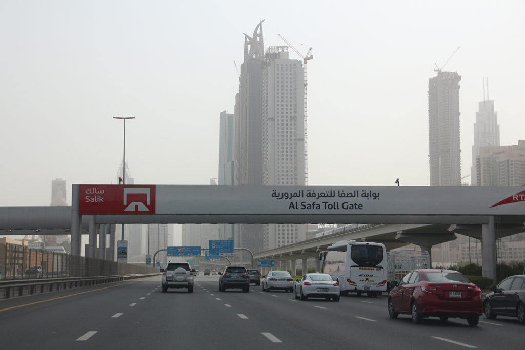 晨早時份的 E11 高速公路的車流量不算太大,感覺就有點像在美國的洲際公路上一樣奄悶,兩旁的沙漠並硬種上大樹,除了天上混濁的黃沙天外,一點都不像在沙漠之中,不過在這條路上,的確要很提防測速拍照,幾乎每公里都會有柱狀的測速相機,一超過 140km/h 就立即拍照,更容易「中招」的更是「龍門架」後方也例牌有隱閉相機,所以當地人也嚴格遵守 140km/h 的上限,幾乎沒有見到測速的車輛。