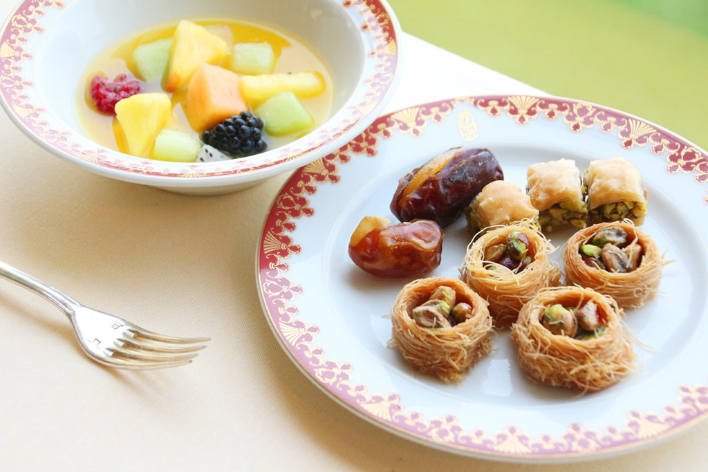 Al Iwan 的午餐是以中東特色為主的自助餐,對香港人來說新鮮感十足,進入餐廳前,職員先安排兩杯藏紅花 Welcoming Drink 讓我們消暑,然後再帶我們到每一個區域講解不同的中東特色美食,才帶我們返回自己的座位。由於我們兩個月前已經訂位,職員早就安排了可以欣賞波斯灣景色的海景位給我們,心思十足。