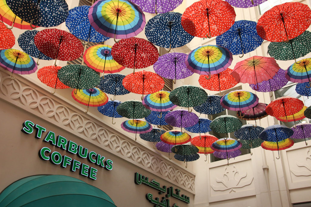 一走進 Dubai Mall,我們已經迅即再被不同的分區搞得一頭霧水,所幸商場內也有很多拍照位,像我們停車區下方的 Demin Zone 就的傘天花陣,既可以拍照留念,又可以作為方向標認路。