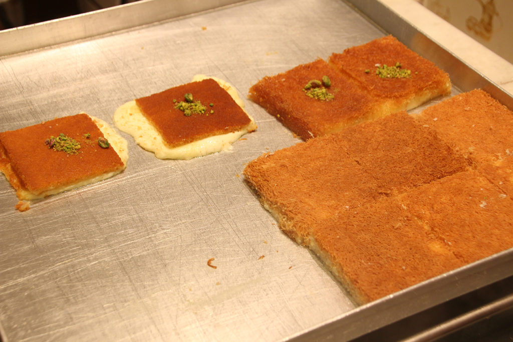 另一面,職員也在即席製作Kunafa,這種以米線和芝士混成餅底的糕點,是齋戒月的傳統甜食,熱辣辣入口,相對外面市集預制的截然不同,不買也可以隨便試吃。