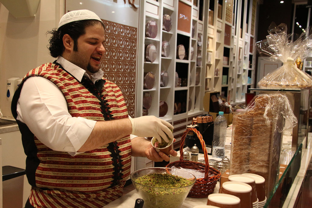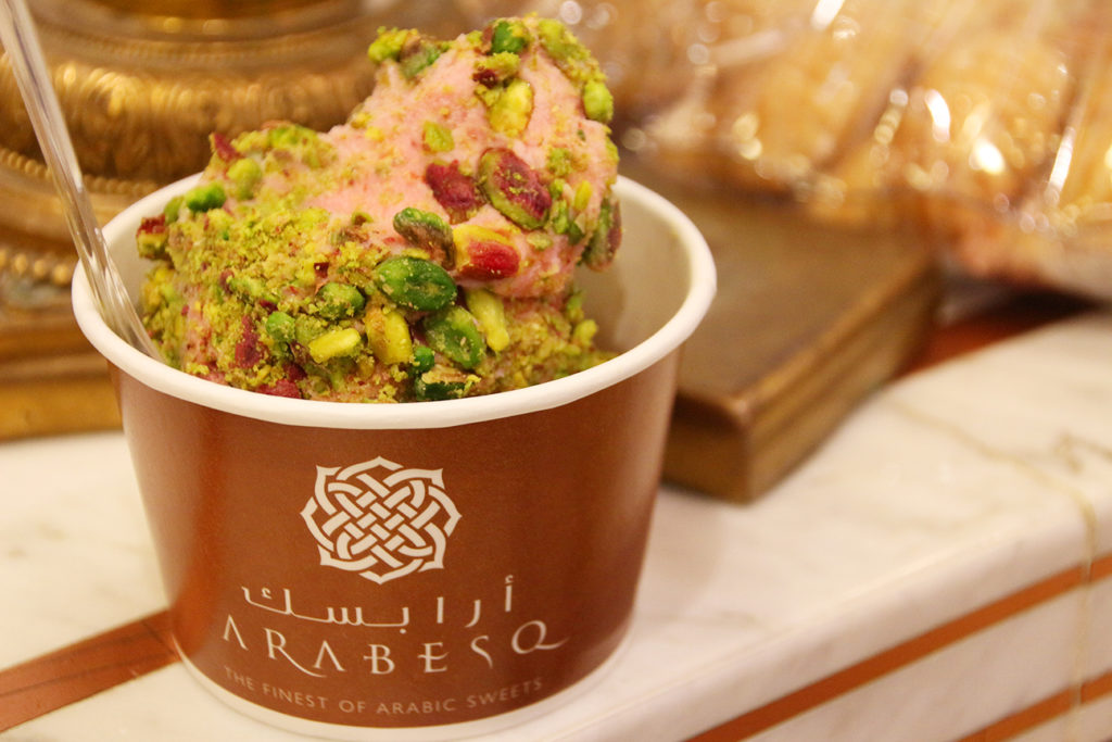 想品嘗來自中東各地不同甜品的話,絕對不能錯過位於 Dubai Mall 地下的 Arabesq Sweets,大門旁的兩位大力士,即席制作敘利亞著名的大馬士革雪糕,這種黏性較高的雪糕,在大力士「搓圓㩒扁」後,再會加上大量碎開心果,鹹鹹甜甜般,相當特別。