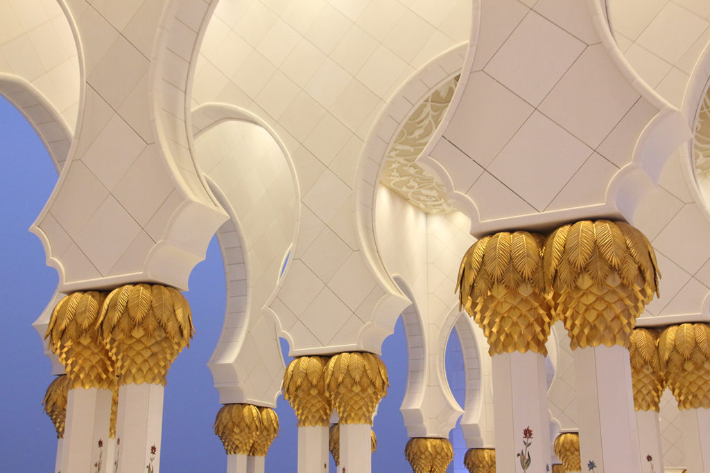 走近清真寺,才會發現它是何其浮誇,清真寺的建設團隊,來自印度、意大利、德國、埃及、土耳其、摩洛哥、巴基斯坦、馬來西亞、伊朗、中國、英國、紐西蘭、馬其頓和阿拉伯聯合酋長國多個,大量使用了大理石、黃金、半寶石、水晶和陶瓷等珍貴材料。