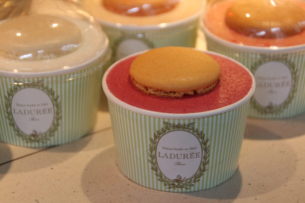 逛過老佛爺後,更不可錯過對面春天百貨地鐵站出口旁的 Ladurée 的雪糕車,這家以馬卡龍聞名的甜品店,在亞洲的分店就是常常大排長龍,就算是香榭麗舍大道本店外一樣有可怕的長長人龍,唯獨是這些小雪糕車才不用等候,特別推介這些小車的雪葩,口味都是以水果為主再配上馬卡龍,像我們的紅莓雪葩配熱情果馬卡龍,真的超醒胃。