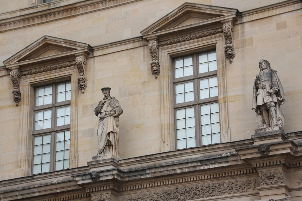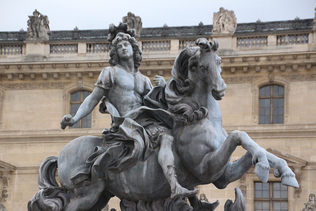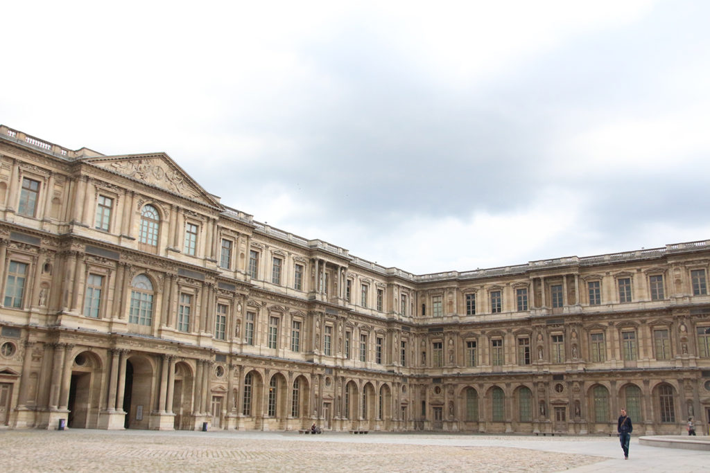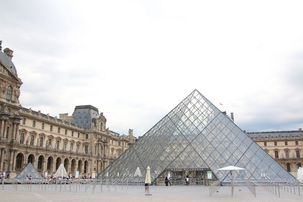 我們從卡利庭園(Cour Carree)進門,走進中庭四面的文藝風興風建築,頓時與外面熱鬧的巴黎市景截然不同,走進了中央廣場,在貝聿銘設計的玻璃金字塔旁,巧妙地看不到巴黎市中心的高樓大廈,自成一角的設計,實在令人讚歎一班城市設計者。