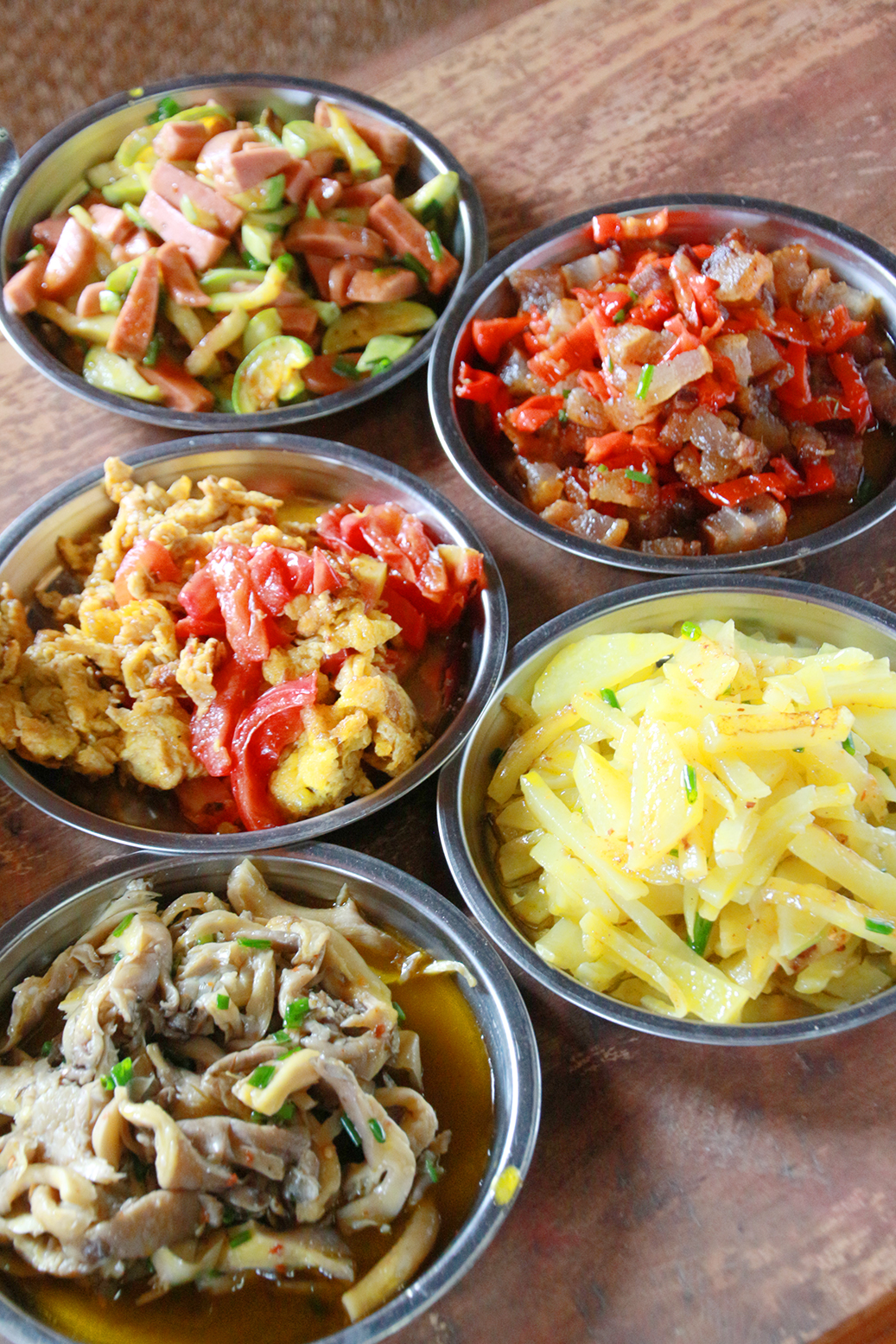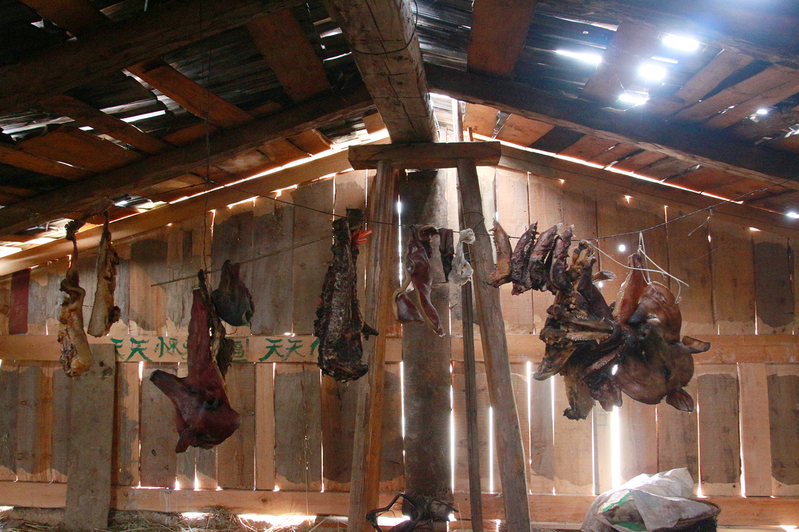 接待我們的藏民嬸嬸,先帶我們爬到屋簷下用作風乾和腌製臘肉的地方參觀,然後就帶我們到客廳,即席透爐製作午膳給我們,雖然 5 餸 1 湯只有青瓜炒腸仔、炒薯仔絲、番茄炒土雞蛋、紅椒炒自制臘肉、
