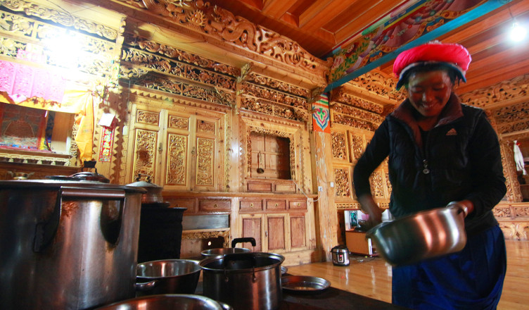 終於到了要探訪的藏民民居,兩層木搭的房子,白色外牆配上彩繪窗框,外觀與其他房子無異,仍讓人抱著是否形象工程的懷疑,但踏進房子內,與外面如出一轍:簡樸,很多空間都是空蕩蕩的,裝飾和設備都不見驚喜,大大增加了真實感,像是告訴我們,只是活在窩居的我們看不慣而已,在人口密度如此低的高原上,大屋又何足掛齒呢?