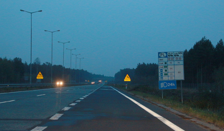 長期跑在 200km/h 以上,車的耗油量比起平常起碼要高一倍以上,以德國 €1.6/L 的油價來說就差不多要 €0.2/km,滿油從柏林出發到達邊境時已剩下一半而已,原本打算在德國加油才出境,但在高速下連出口都錯過,一口氣就跑到了德國和波蘭的隔界橋上,進入波蘭後,先到邊境的加油站兌錢,趁著天未黑透就繼續沿 E36 高速公路東進。
